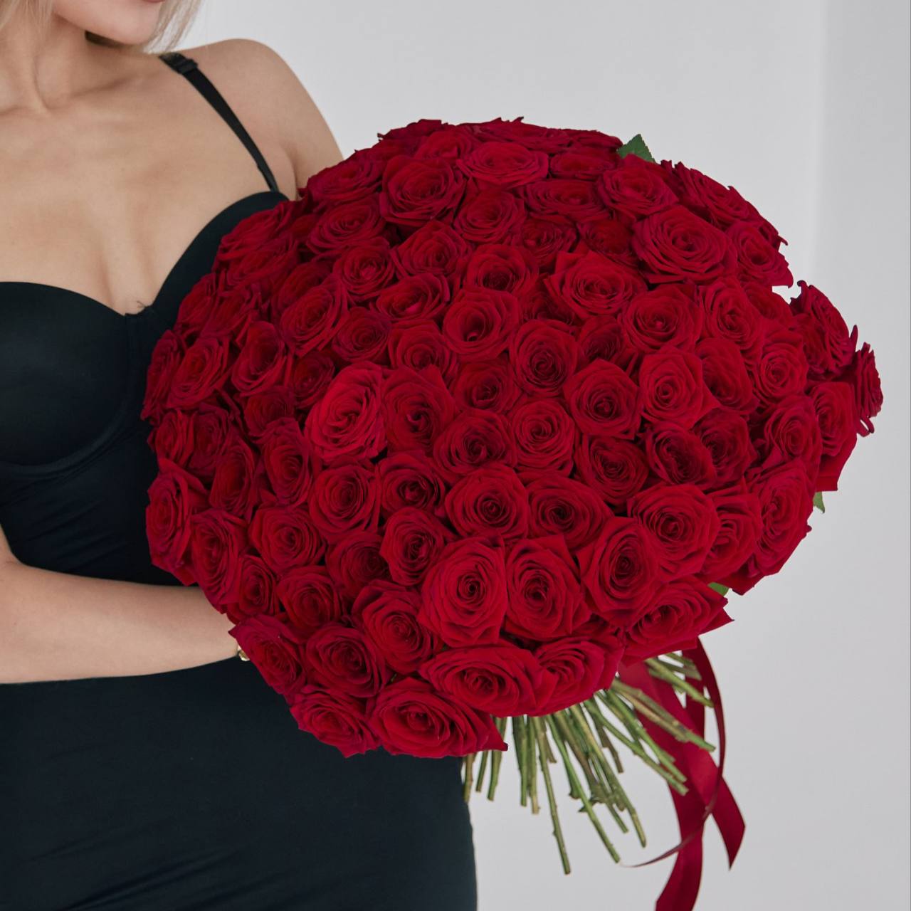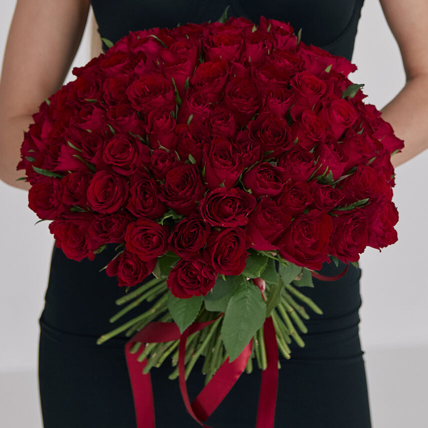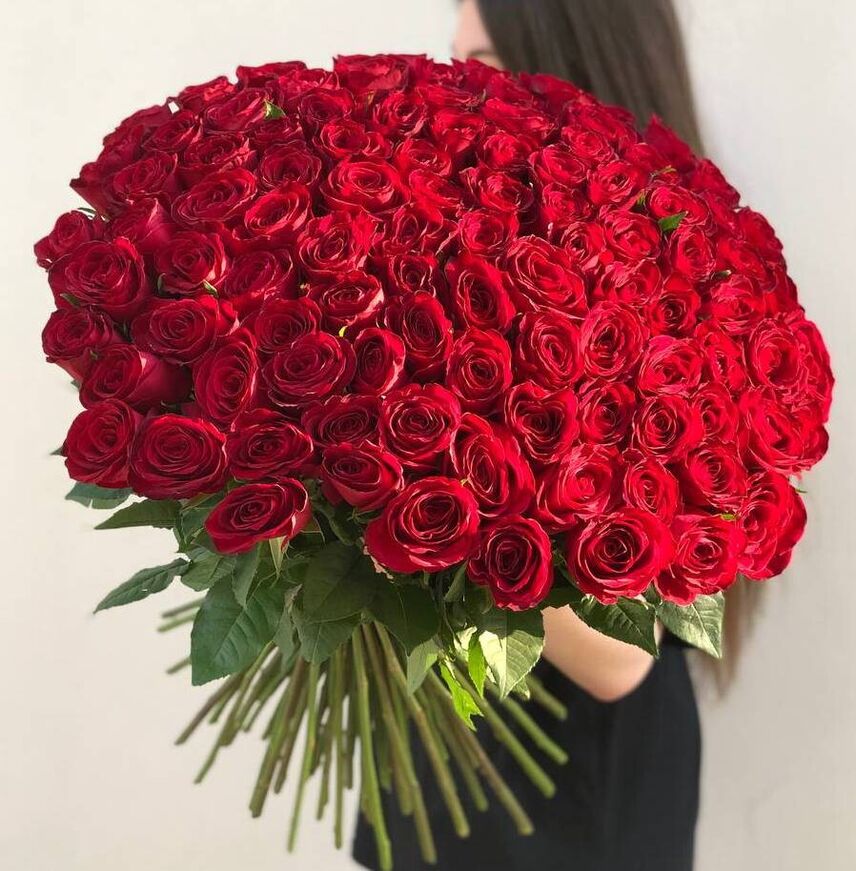 101 красная роза (Импорт), оформленная атласной лентой.