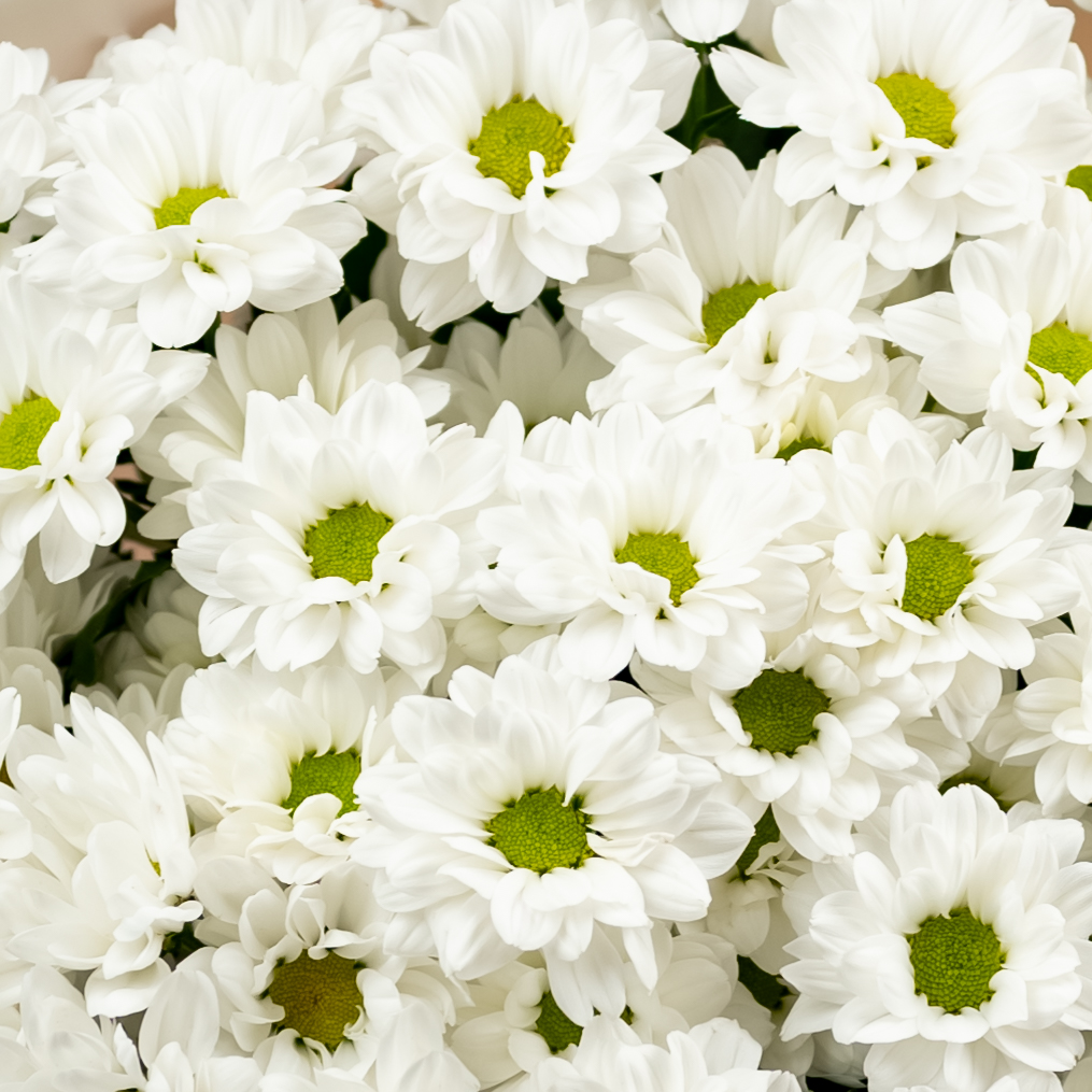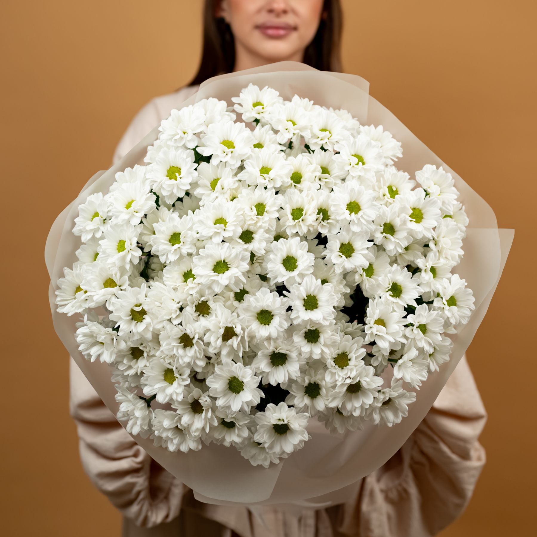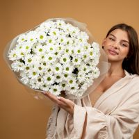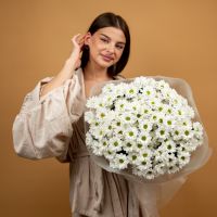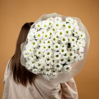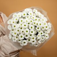 Букет из стойких кустовых хризантем в красивом оформлении.