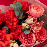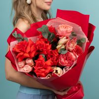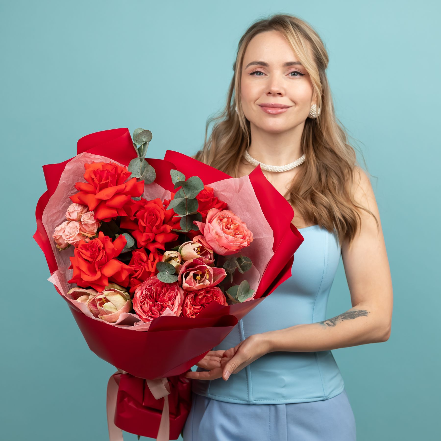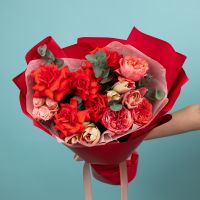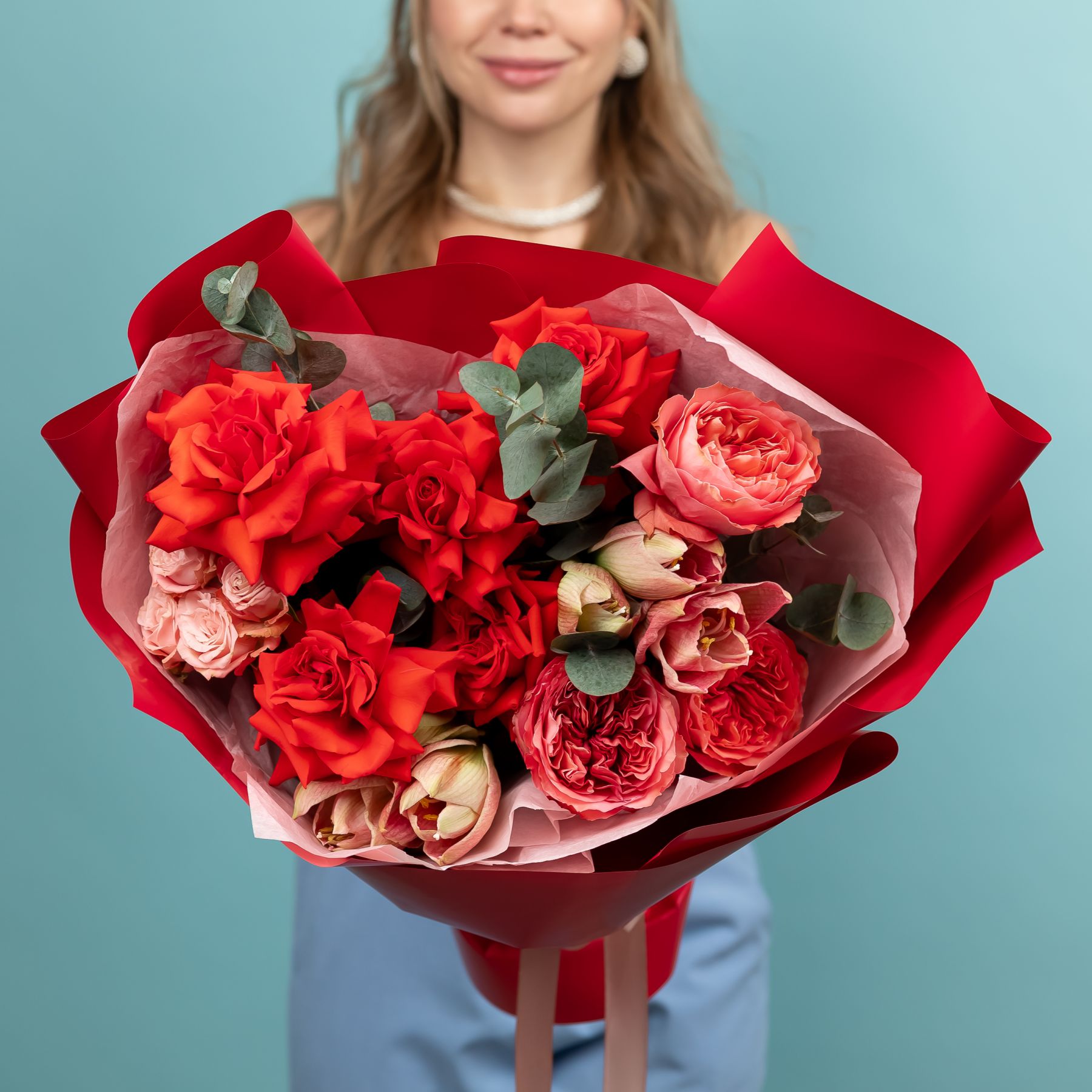 Состав букета может быть изменен исходя из актуального наличия и сезонности цветов, с сохранением цветовой гаммы букета