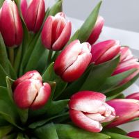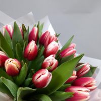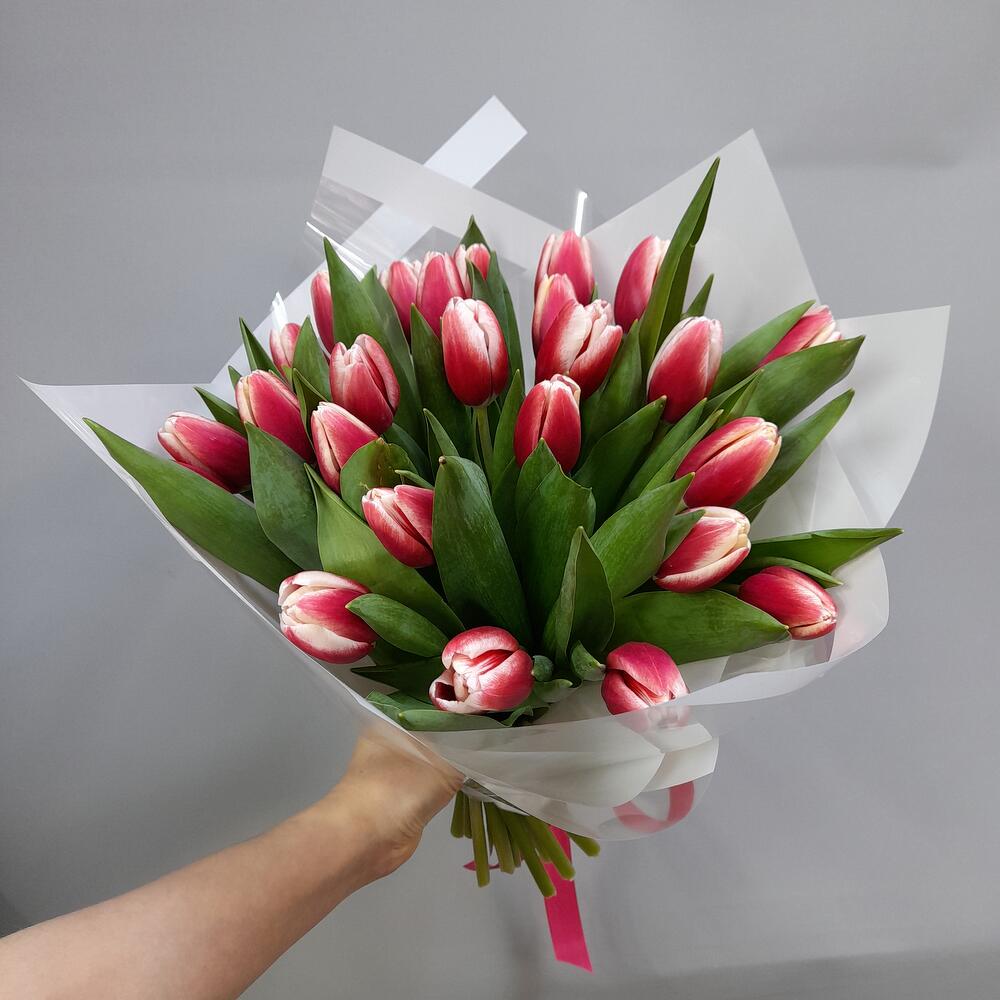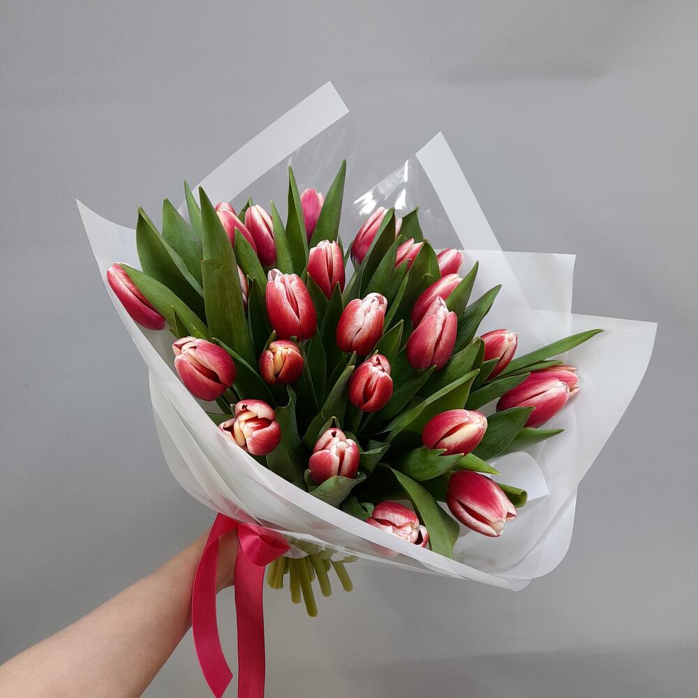 Букет из 25 очаровательных красно-белых тюльпанов в упаковке . Упаковка букета может отличаться от фото !