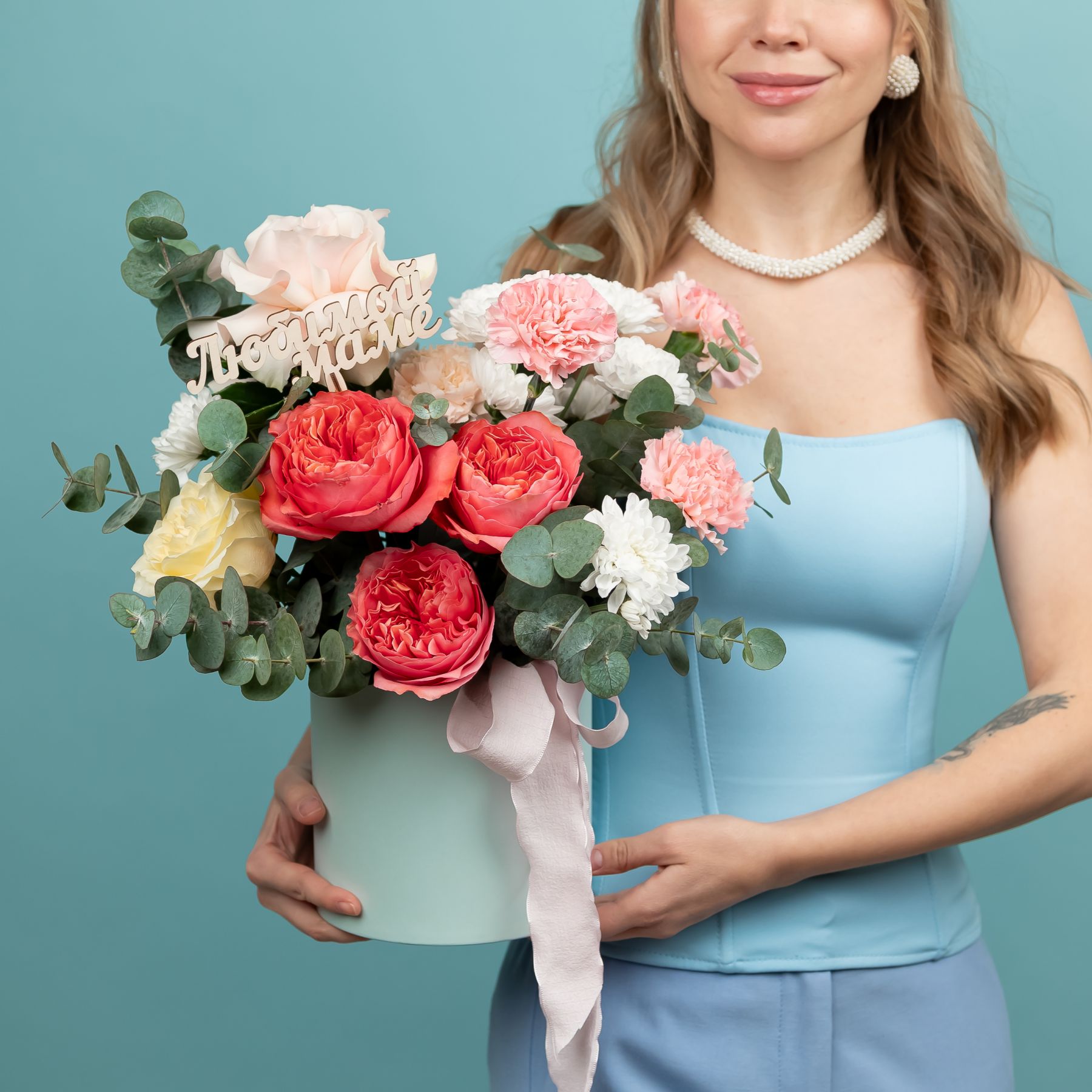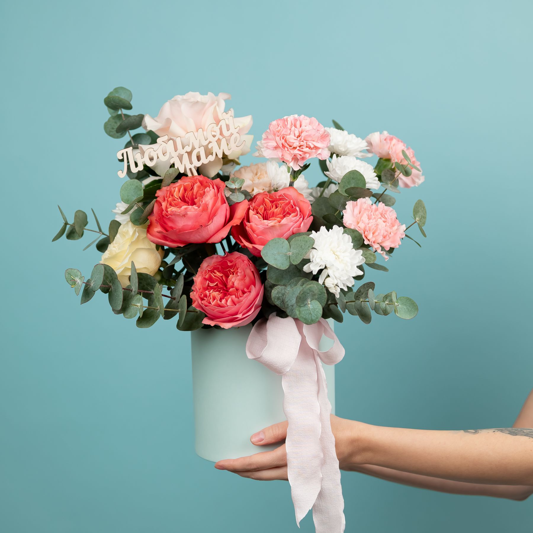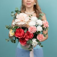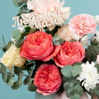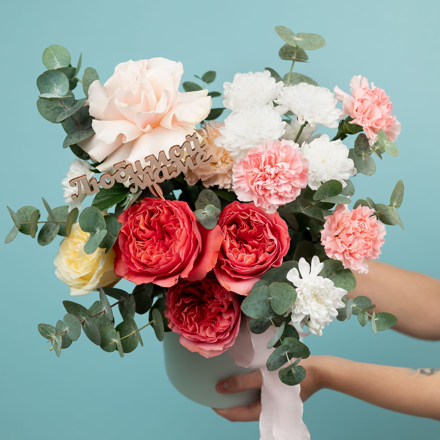 Состав букета может быть изменен исходя из актуального наличия и сезонности цветов, с сохранением цветовой гаммы букета. Топпер представлен как пример. Приобрести его можно в разделе доп.товары.