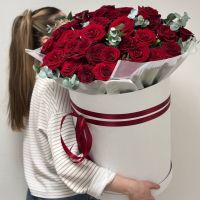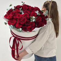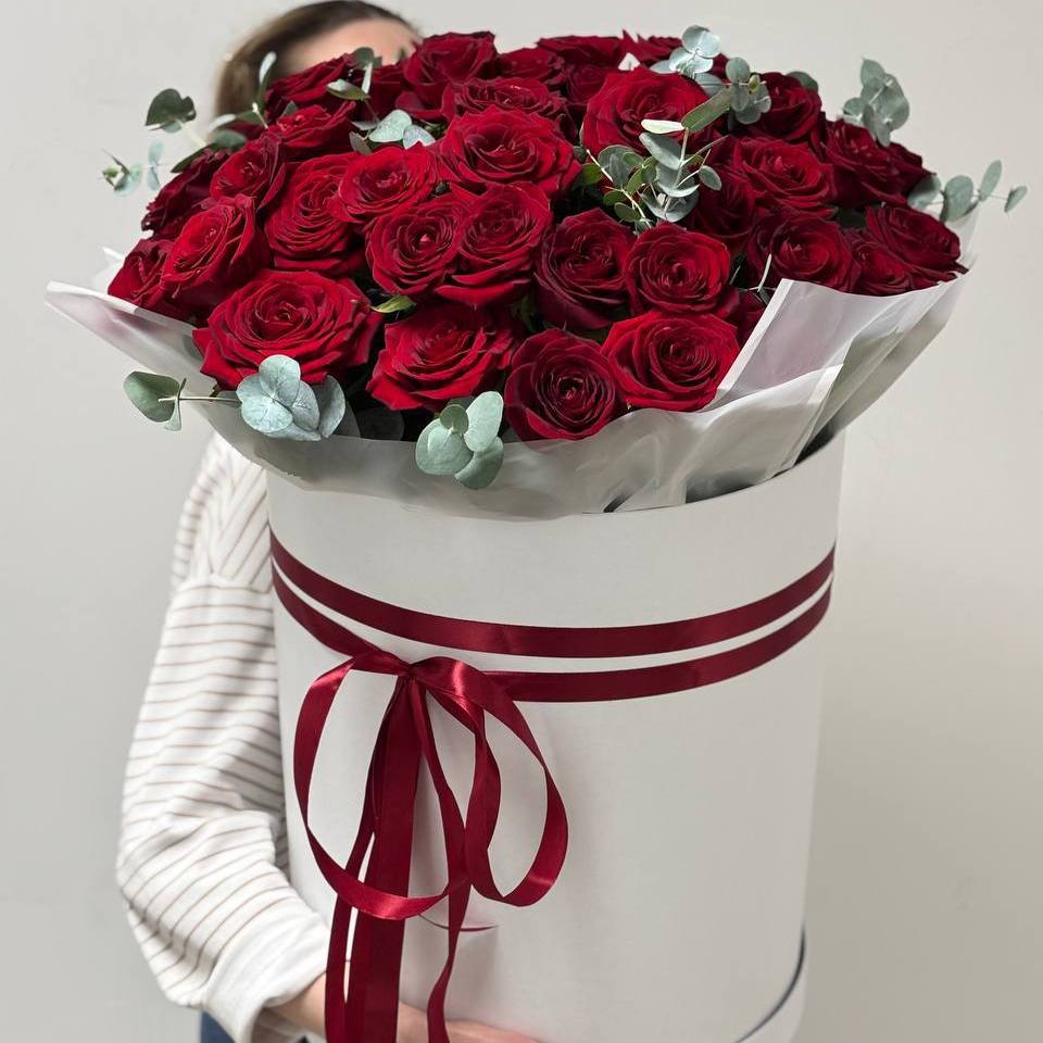 Композиция-гигант в шляпной коробке из 51 розы с эвкалиптом (50см) для создания Вау-эффекта.
