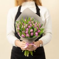 Букет из 31 тюльпана сиреневого цвета Голландия, упакован в пленку и атласную ленту.