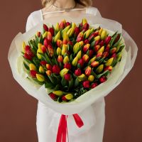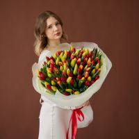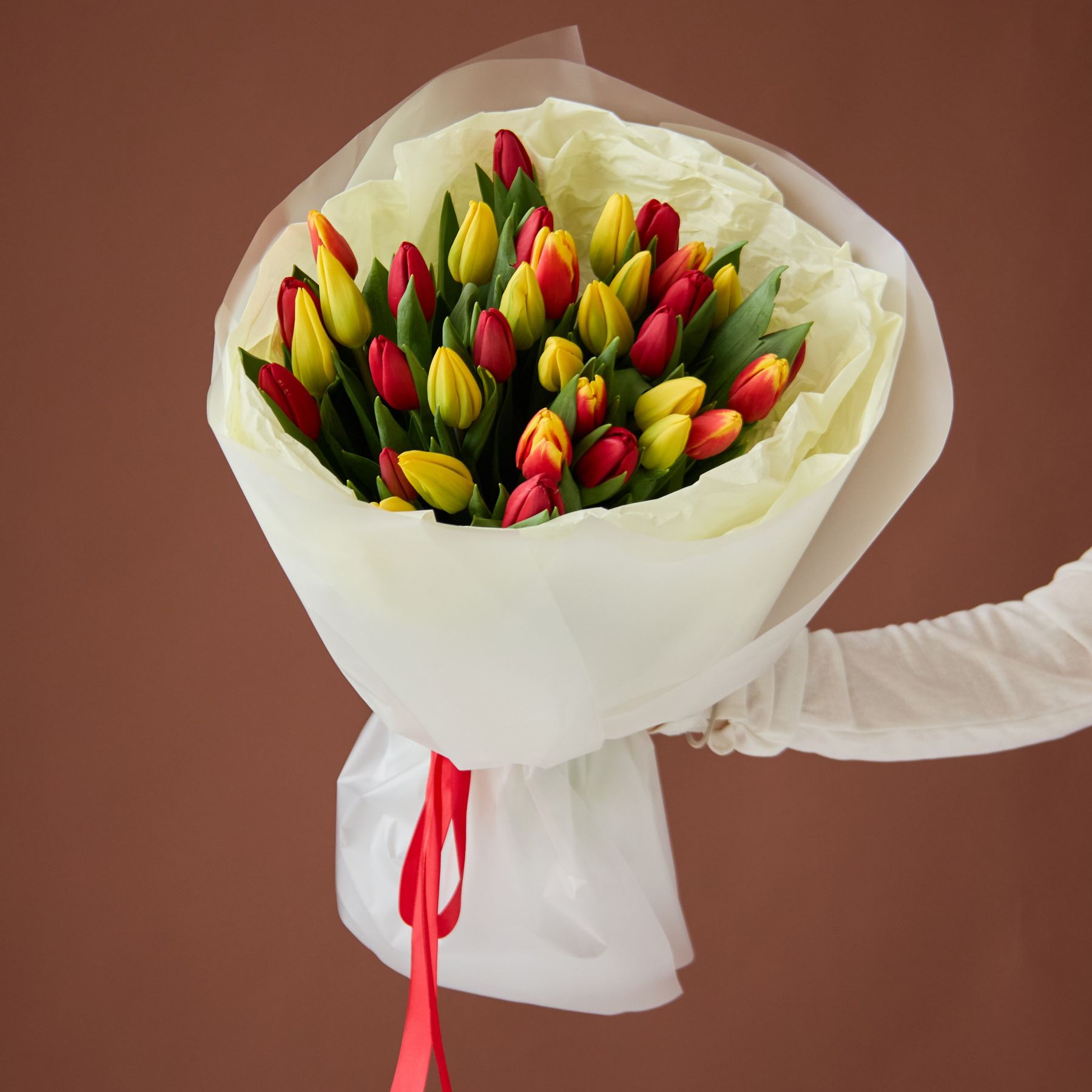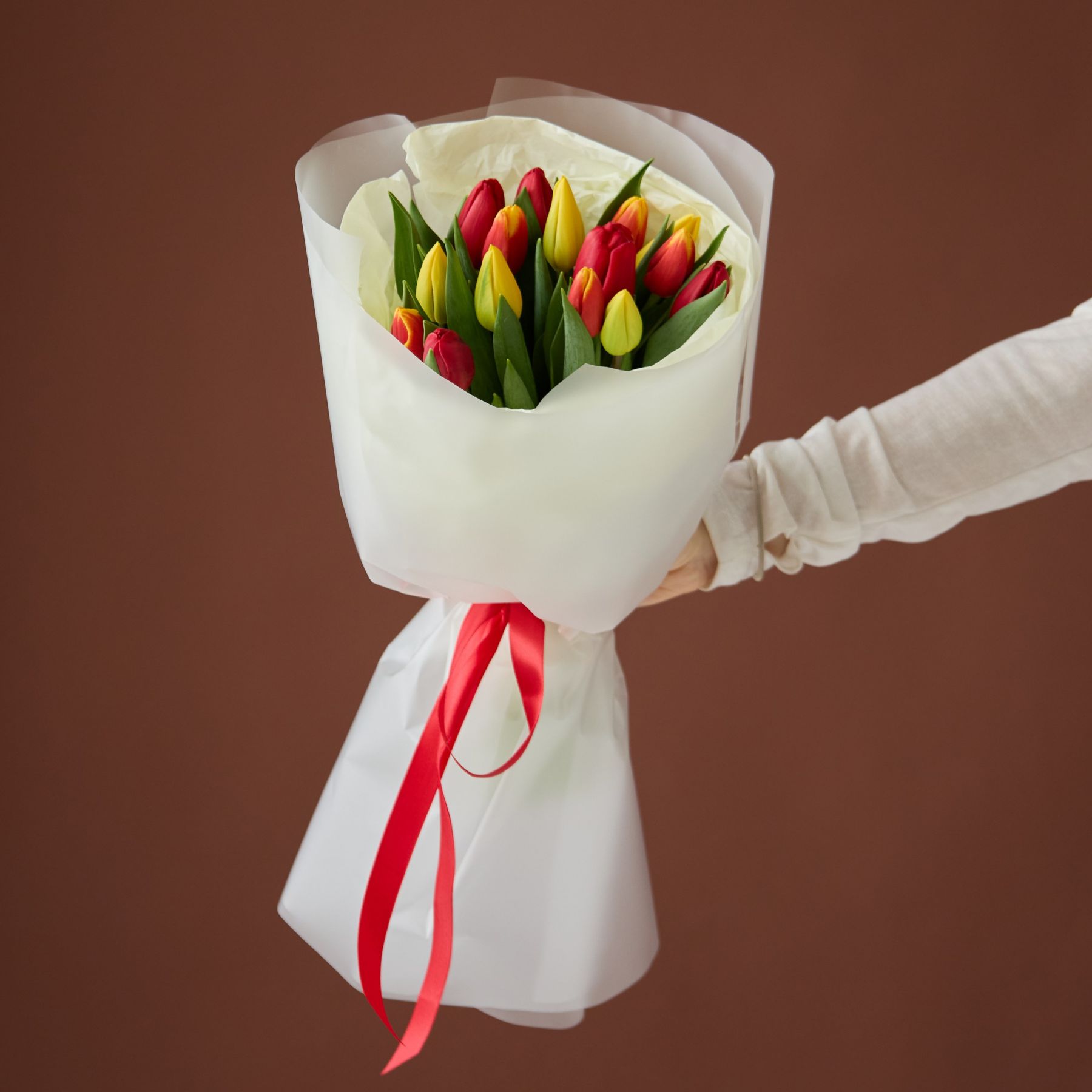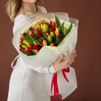 Букет из тюльпанов цвета микс в дизайнерской упаковке с атласной лентой.