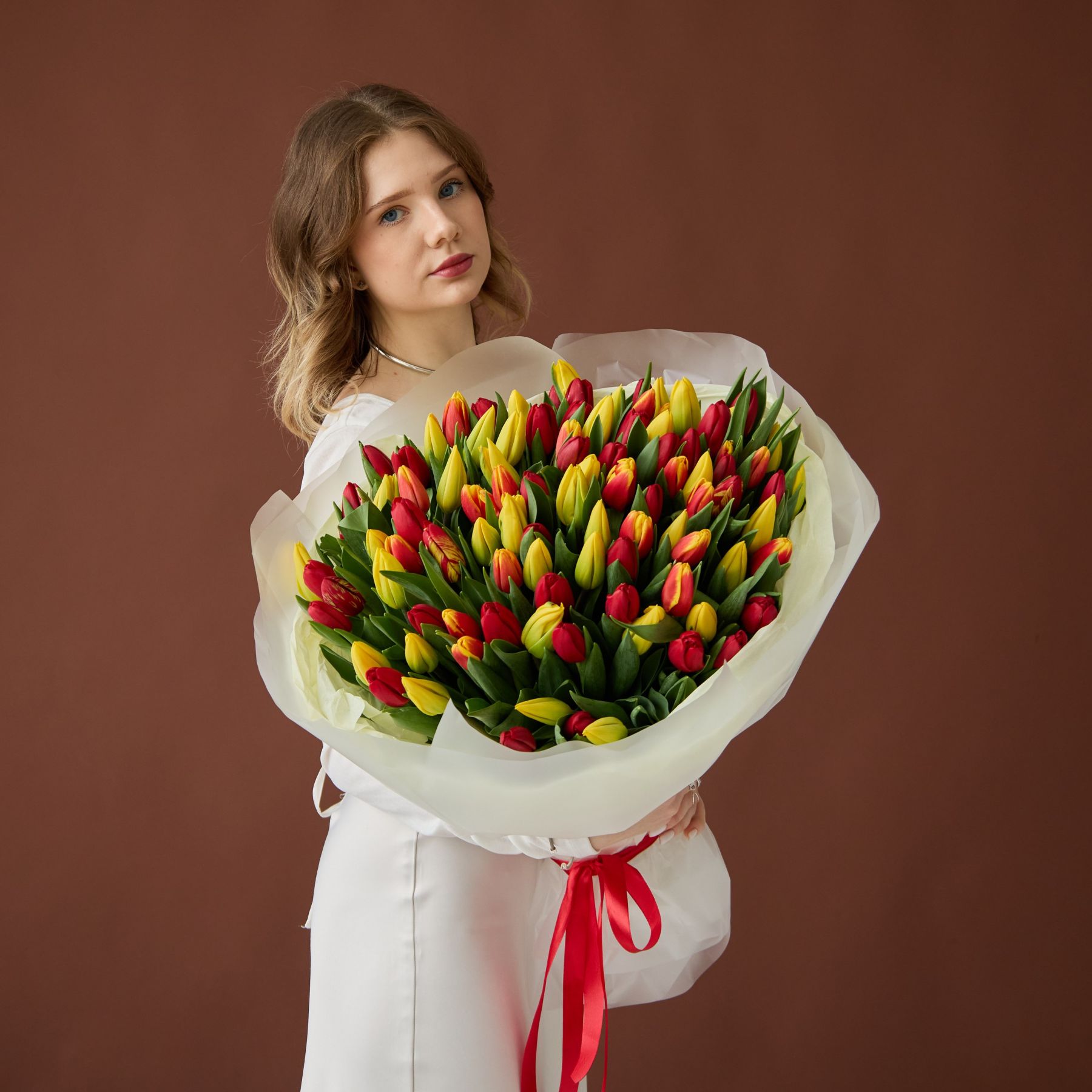 Цвет тюльпанов может быть изменен, в зависимости от наличия в праздничной поставке.