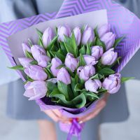Нежный букет тюльпанов сиреневого цвета в красивой упаковке.