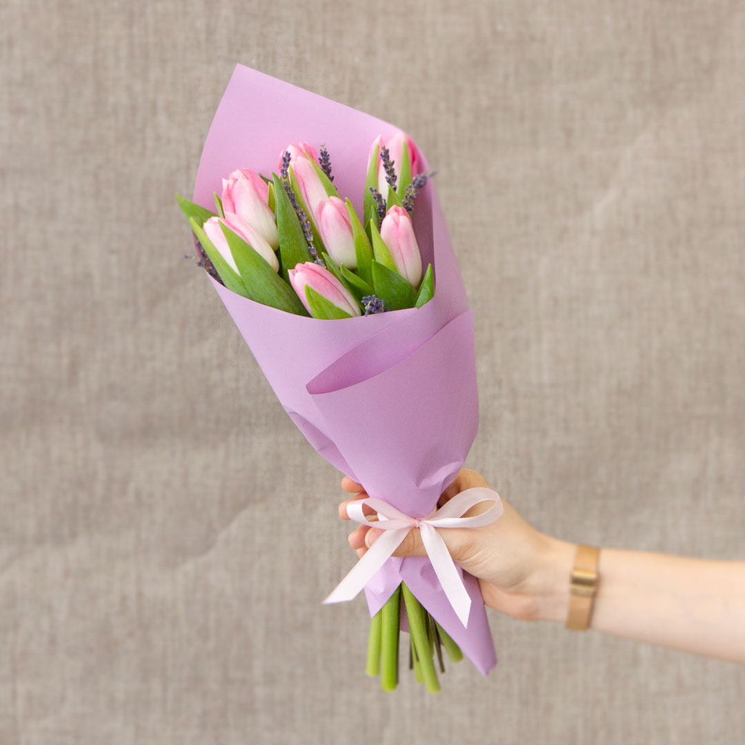 Букет из 7 розовых тюльпанов с душистой лавандой*. Упакованы в сиреневую корейскую пленку с атласной лентой.