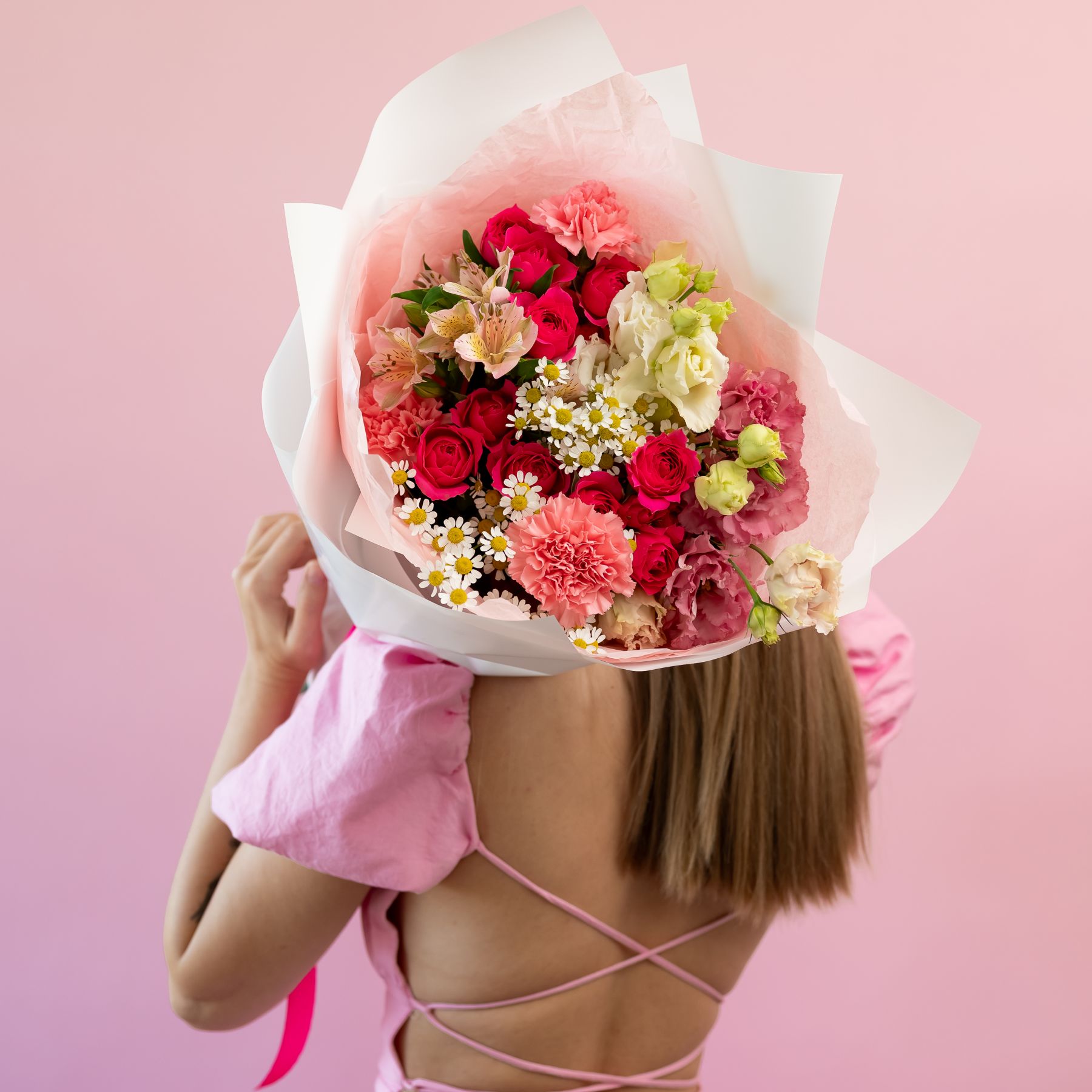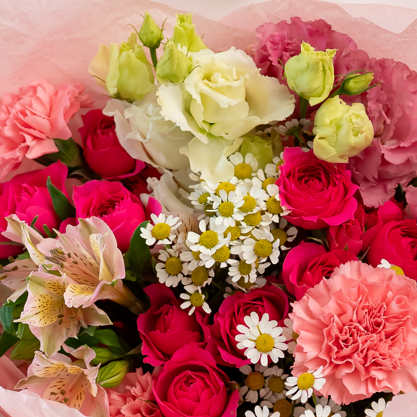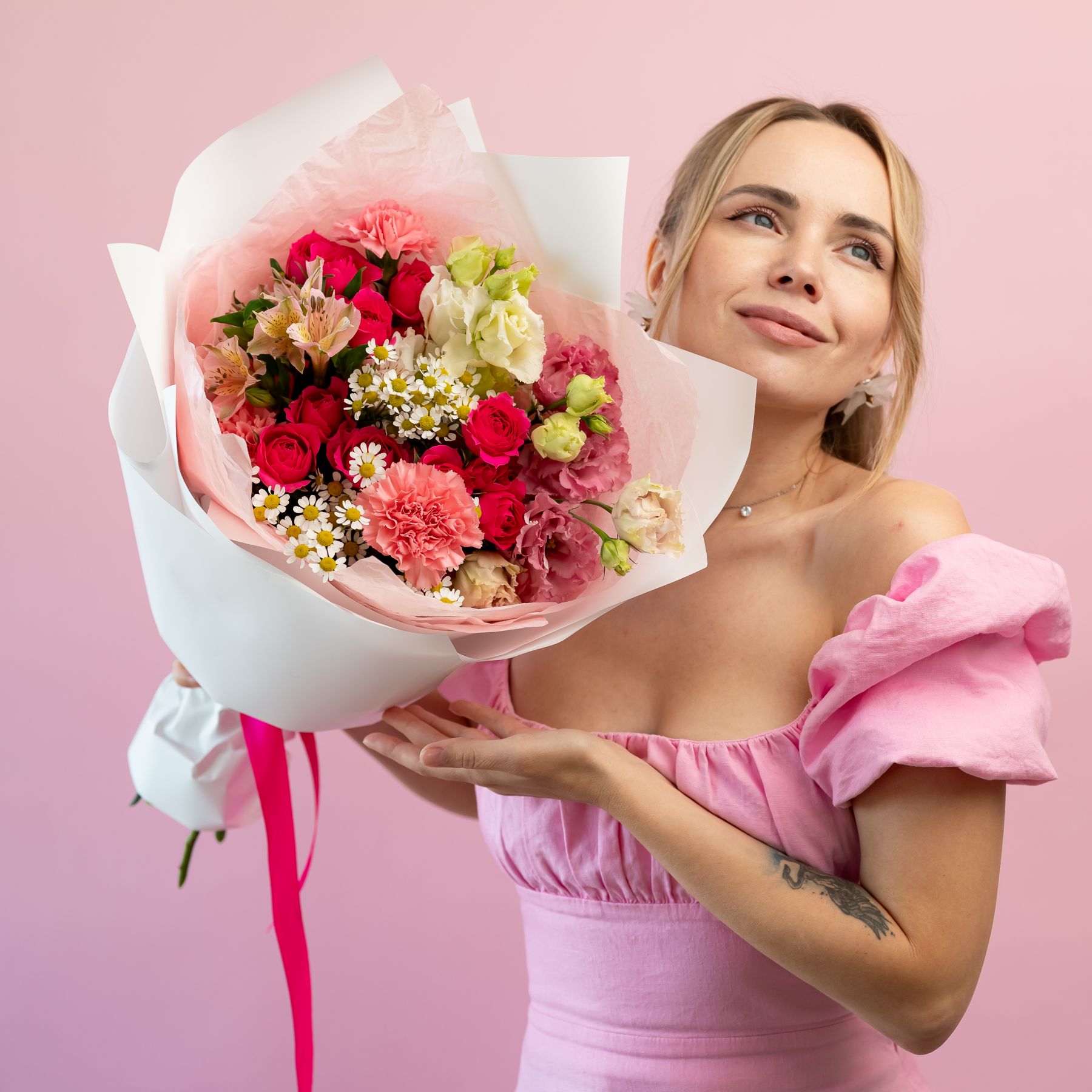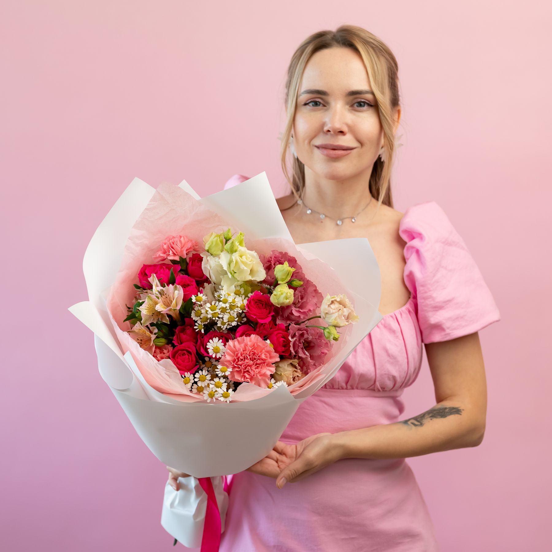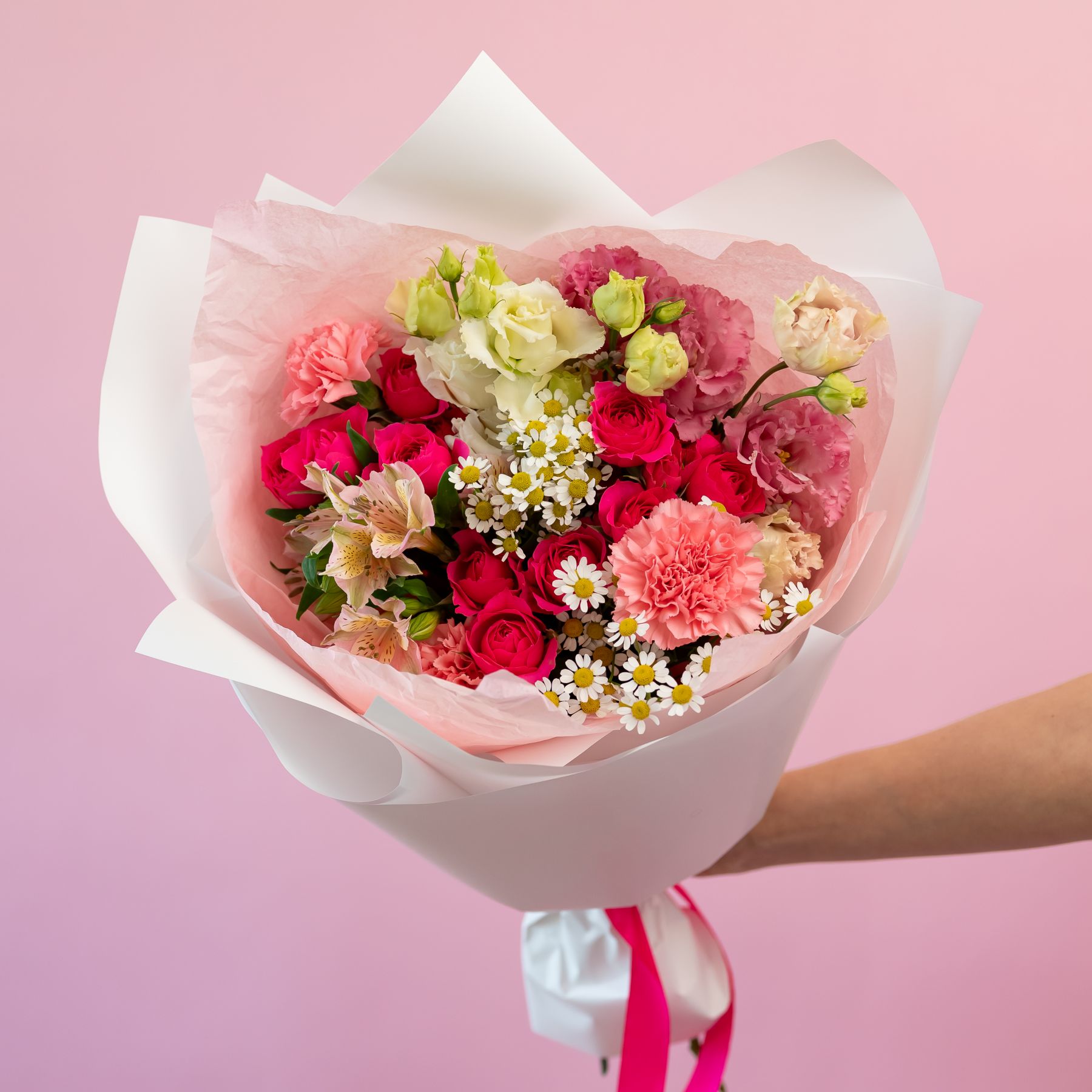 Состав букета может быть изменен исходя из актуального наличия и сезонности цветов, с сохранением цветовой гаммы букета